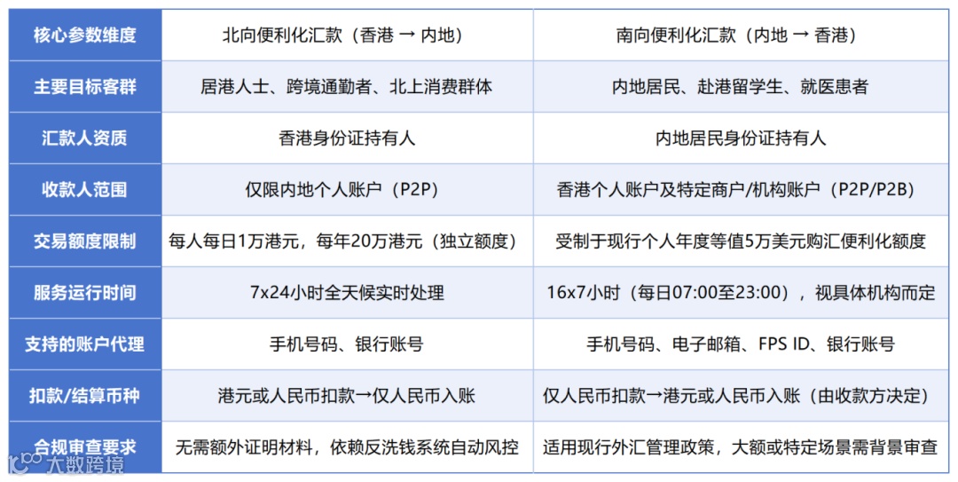 南向汇款(内地至香港)方面,内地居民汇款上限为现行个人年度购汇便利化额度 5 万美元,服务时间为每日上午 7 时至晚上 11 时
