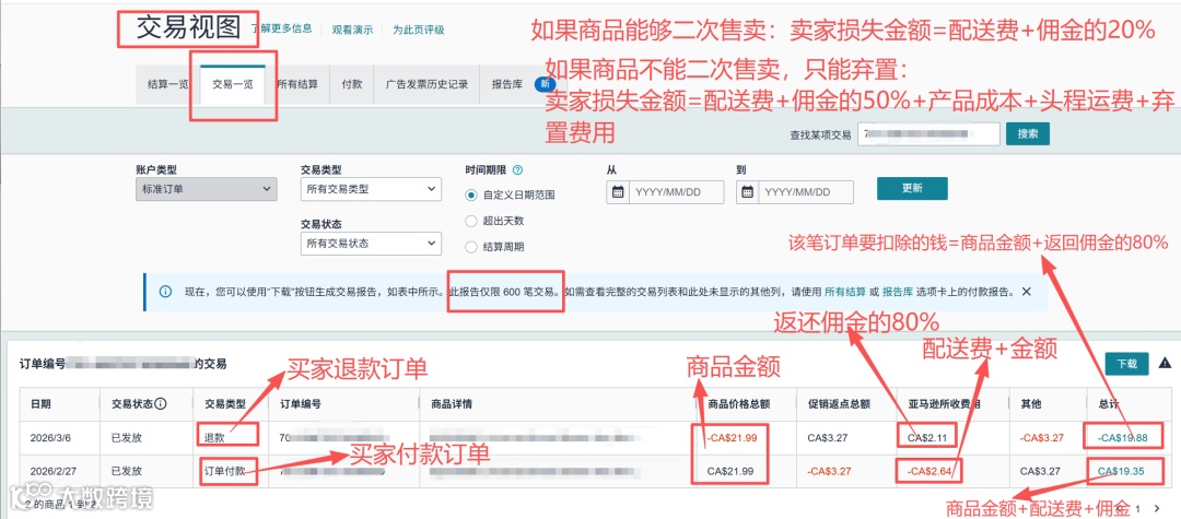 如果商品能够二次售卖:卖家损失金额=配送费+佣金的20%