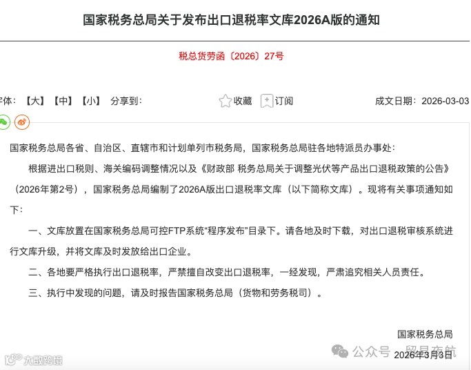 2026年3月3日,国家税务总局发布《关于发布出口退税率文库2026A版的通知》,正式启用2026年最新版出口退税率。