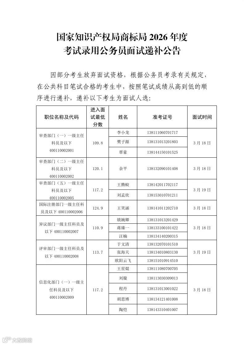近日,国家知识产权局发布《2026年度考试录用公务员面试递补公告》,对部分职位因考生自愿放弃或未通过资格复审等原因产生的空缺名额,按笔试成绩从高到低顺序进行递补。