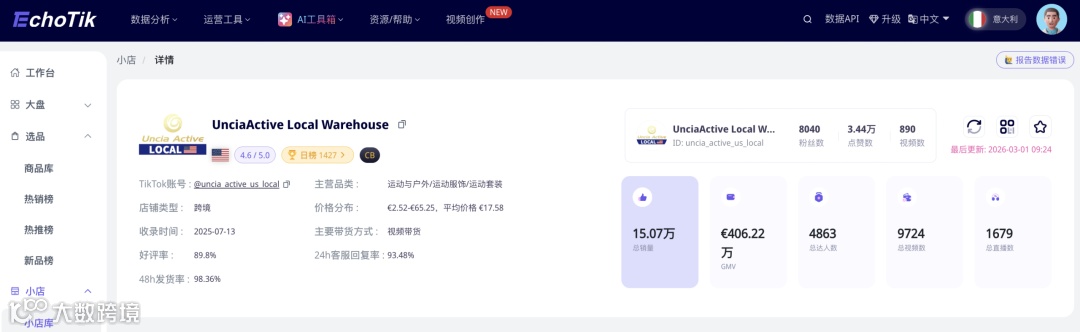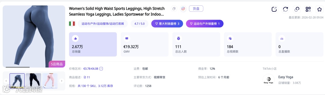 除该爆款瑜伽服外,另一款瑜伽裤已登顶意大利TikTok 7日销量榜;多款运动服饰近一周销量持续攀升,反映整个类目正从单品爆发迈向多点开花。