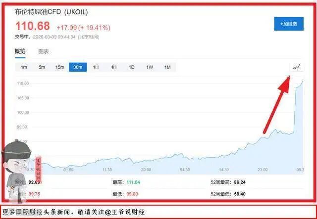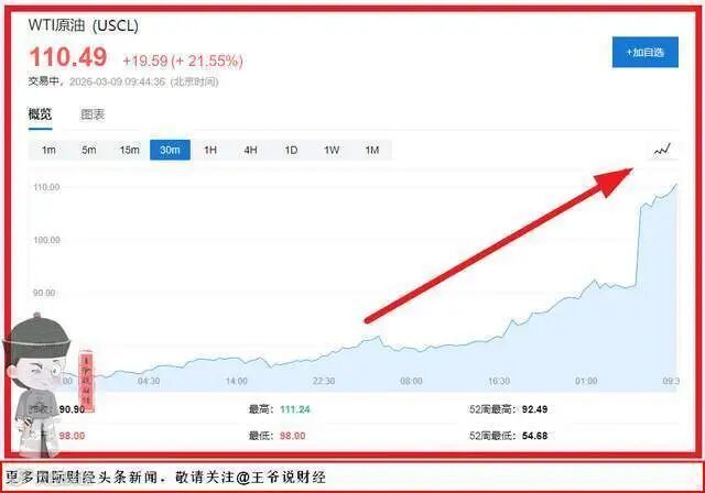 王爷说财经讯:3月8日,国际原油市场大幅上涨。布伦特原油期货盘中突破110美元/桶,最高达111.7美元;美国WTI原油单日涨幅约20%,亦突破110美元,最高报112美元。