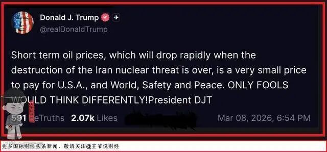 美国总统特朗普在社交平台称:“短期油价上涨,是和平所需付出的‘微小代价’。”该表态迅速引发全球关注与争议。