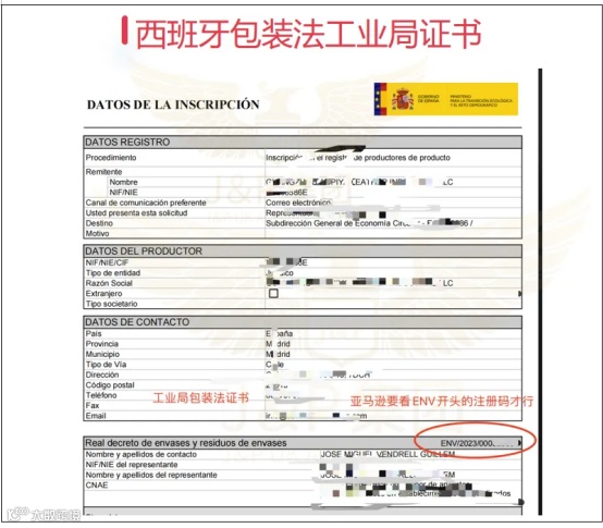 因亚马逊对西班牙包装注册号有明确格式要求,需为“ENV/注册年份/9位数字”(ENV为固定前缀,注册年份为生产者登记簿中的注册年份,末尾为9位数字),仅工业部颁发的证书可满足该格式要求。
