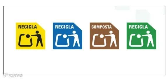颜色分类:统一采用4种颜色标识,对应不同包装材质——黄色(塑料/金属/复合材料)、蓝色(纸和纸板)、绿色(玻璃)、棕色(可堆肥包装)。
