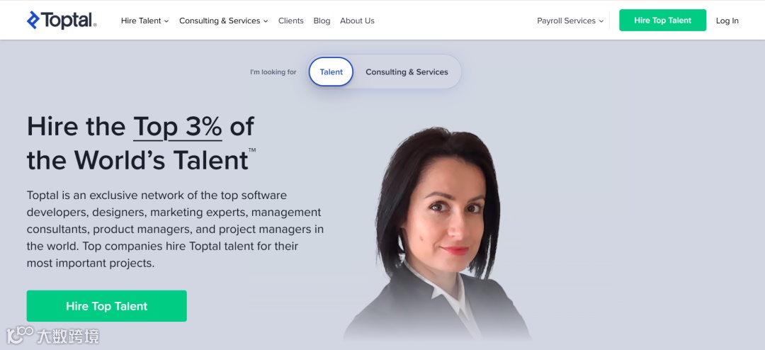 Toptal聚焦高端人才匹配,主要服务于网站开发、产品管理、商业咨询及人工智能、信息安全、数据分析等专业领域,以严格筛选机制著称。