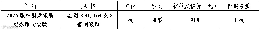 2026版中国龙银质纪念币已于2026年1月15日发行,其中面向境内发售的首发纪念封装版于2026年2月底面市发售,现将具体销售细则公示如下:【发行公告】2026版中国龙银质纪念币