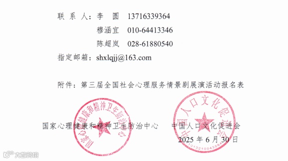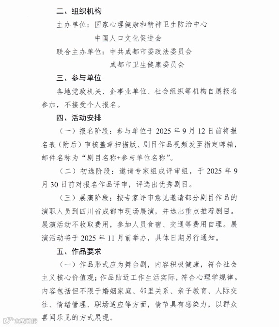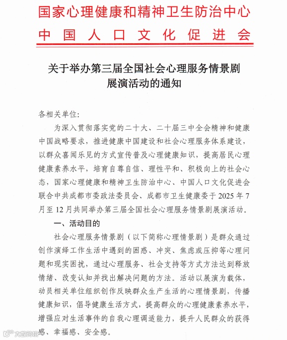 为深入贯彻落实党的二十大、二十届三中全会精神和健康中国战略要求,推进健康中国建设和社会心理服务体系建设,以群众喜闻乐见的方式宣传普及心理健康知识,提高居民心理健康素养水平,培育自尊自信、理性平和、积极向上的社会心态,国家心理健康和精神卫生防治中心、中国人口文化促进会联合中共成都市委政法委员会、成都市卫生健康委于2025年7月至12月共同举办第三届全国社会心理服务情景剧展演活动。