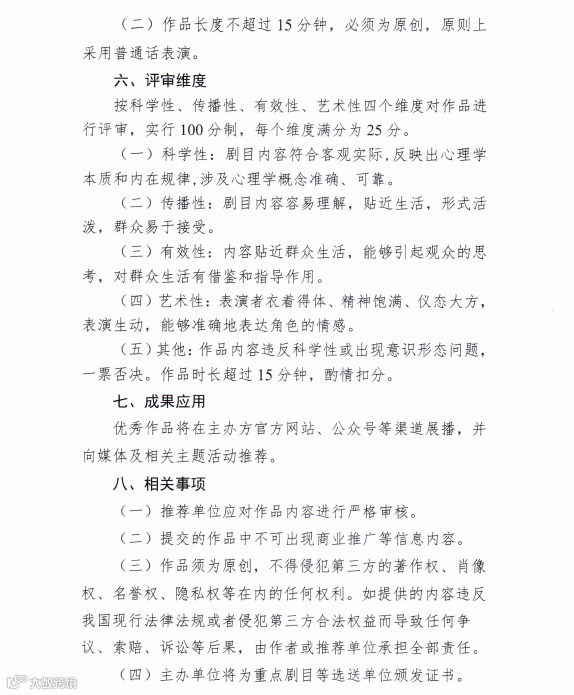 (一)作品形式应为舞台剧,内容积极健康,符合社会主义核心价值观;作品贴近工作生活实际,符合心理学规律。内容包括但不限于婚姻家庭、邻里关系、亲子教育、人际交往、情绪管理、职场适应等方面,情节具有感染力,以群众喜闻乐见的方式展现。