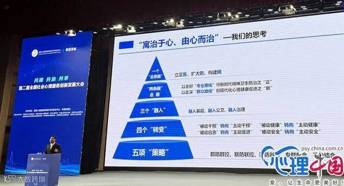在题为《深刻把握中国式现代化对心理健康的需求,推动新时代心理健康事业创新发展》的大会主旨演讲中,国家心理健康和精神卫生防治中心党委书记、主任付强强调,强国必先强心,呼吁构建全社会协同的心理健康治理体系。要“两条腿”走路:以走好“专业路线”守新时代精神卫生防治之“正”,以走深“群众路线”创现代化心理健康促进之“新”。心理健康促进是一项社会工作,需要全社会的参与和努力。政府应通过政策引导和资源投入,构建一个支持心理健康的社会环境。