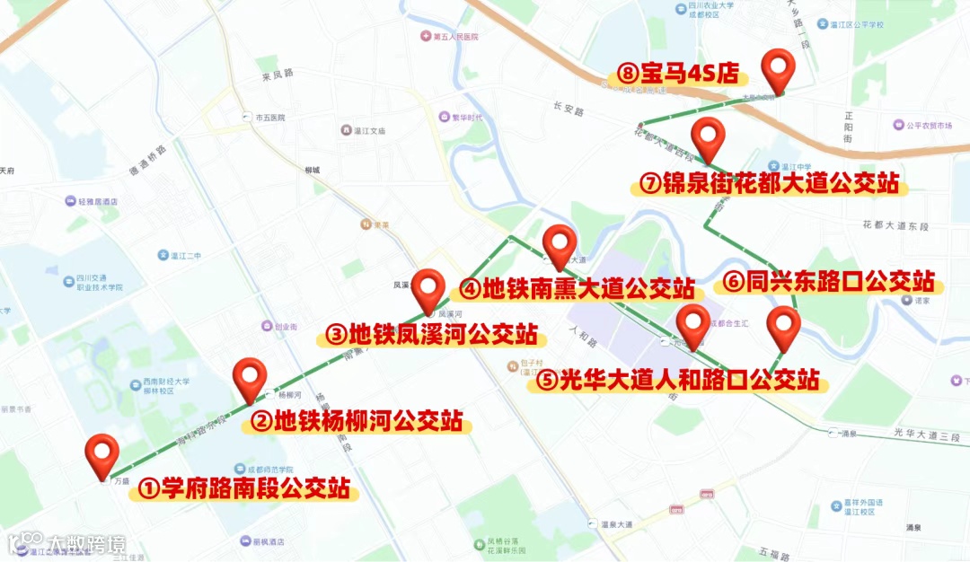 温江上车点:学府路南段公交站(近万盛地铁站旭辉商场对面)→地铁杨柳河公交站(近A口成都师范学院)→地铁凤溪河公交站(近A-B口之间大润发)→地铁南熏大道公交站(近地铁站B口)→光华大道人和路口公交站(近美家家居广场)→同兴东路口公交站(近丽晶港1号门右转50米)→锦泉街花都大道公交站(近七彩花都二期西北门左转50米)→成名高速路口温江收费站(近宝马4S店)