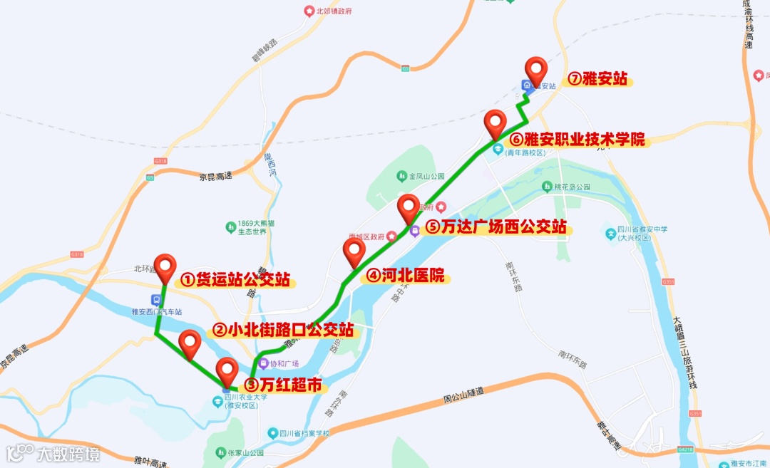 雅安下车点:雅安高铁站→雅职院公交站→万达广场西公交站→河北医院公交站→少年宫公交站→小北街路口公交站→货运站公交站