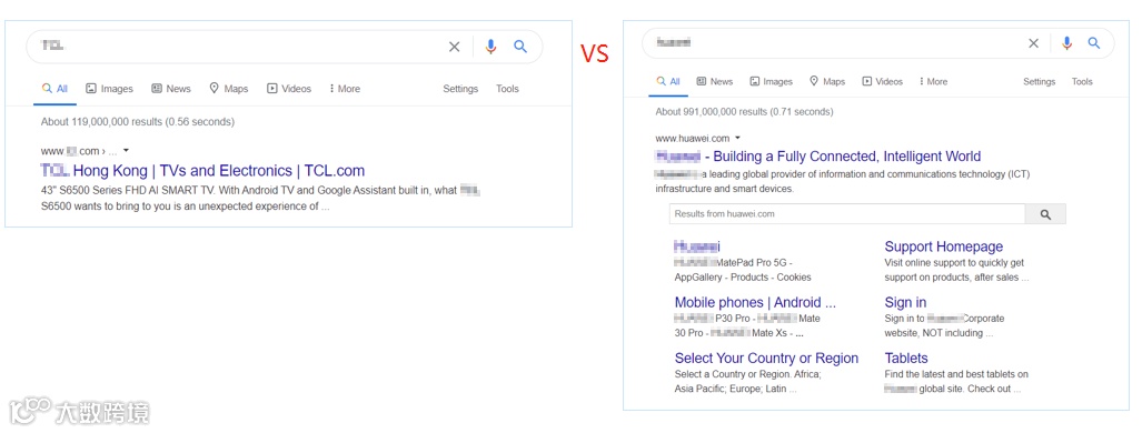 如下图对比两个品牌词的搜索结果,左边的是标准的搜索结果,右边的包含Site Links及 Search Boxes两个SERP Features,展位更多,信息更丰富。实际上品牌影响力在SERP就开始体现并影响消费者对品牌的认知了,更多的曝光相当于品牌获得了谷歌的背书。
