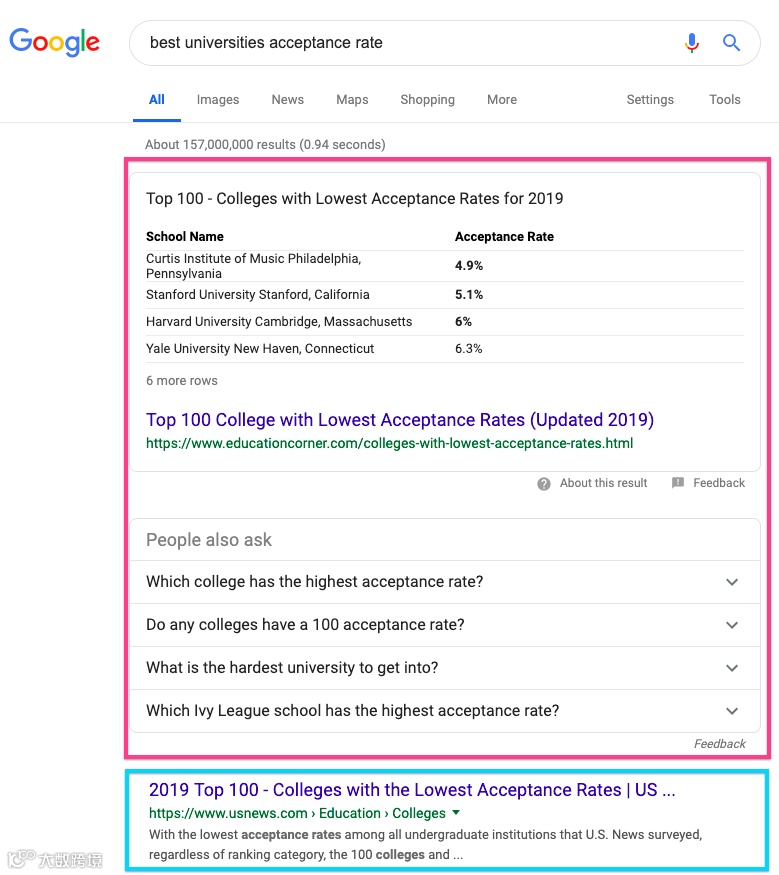 下图中,红框中有两种SERP Features, 顶部的是精选摘要(Rich Snippet),接下来是People Also Ask。而蓝框中的则是传统的标准搜索结果展示形式。