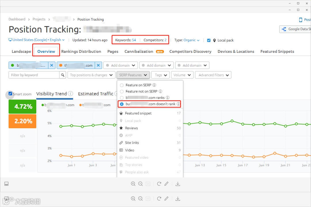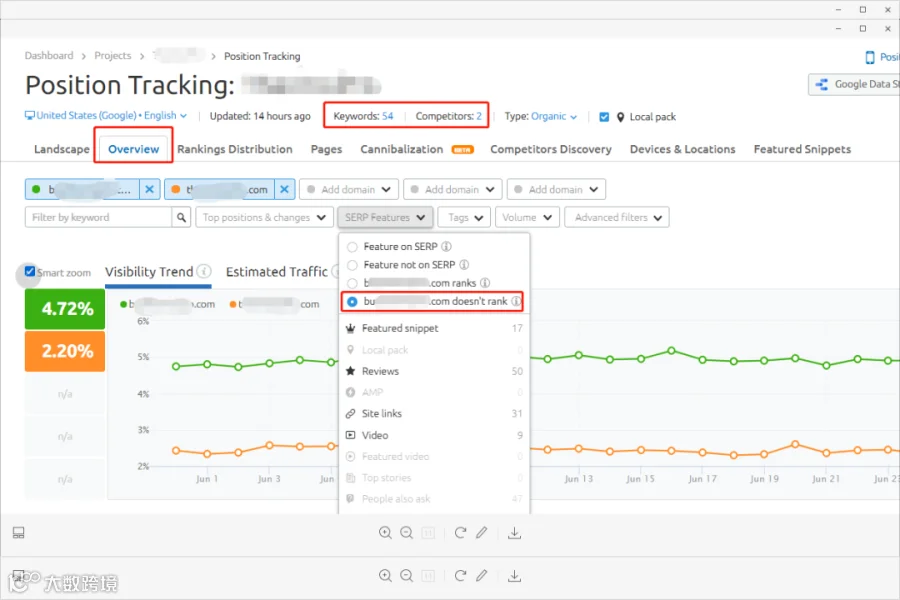 下面介绍另一个方式,仅对比你跟竞争对手网站重叠关键词部分,哪些是竞品对手有获取SERP Features, 而你的网站没有的。