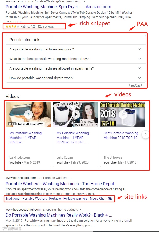 例如,搜索“portable washing machine”, 可以发现搜索结果就包含了下图中的rich, snippet, PAA, Video, site links,以及未截图的product listing ads, carousel, knowledge panel, 等SERP Features。