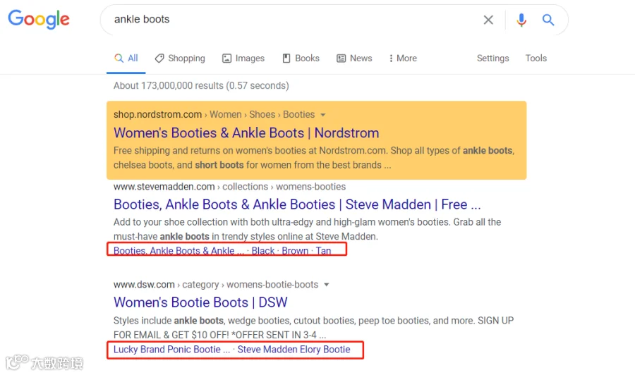 如关键词“ankle boots”,排名第二、三位的竞争对手,均获取了sitelinks展示。接下来就需要具体分析自己网站未能获取的原因,以及如何优化页面促进sitelinks获取。关于如何获取sitelinks展示,可以阅读之前发布的文章 《利用sitelinks促进品牌曝光》。