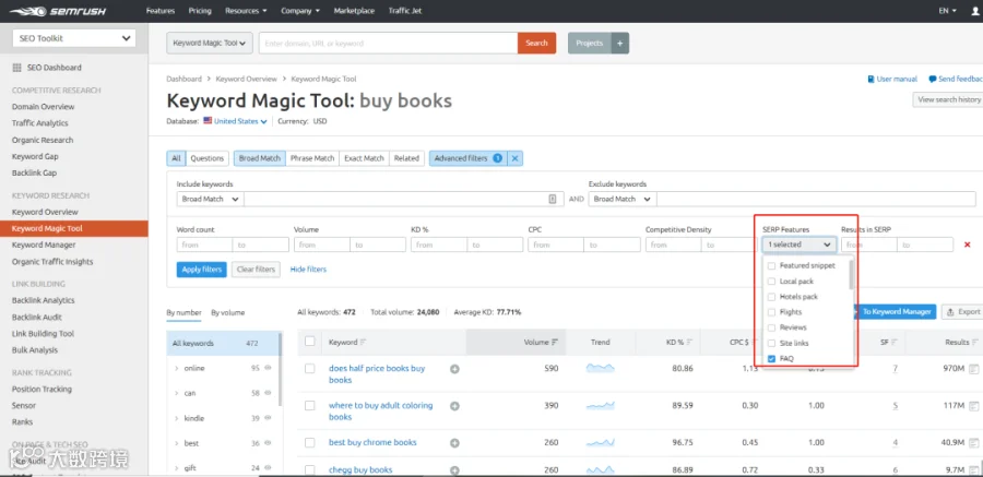 使用SEMrush的Keyword Magic Tool, 可以实现根据SERP Features筛选关键词的目的。