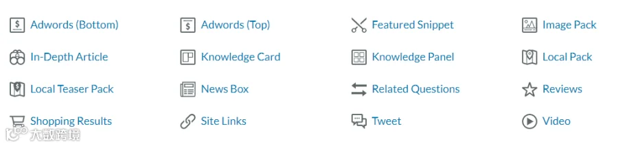 目前谷歌SERP Features的类型已经超过了20+,以下是Moz整理的16种最常见的SERP Features: