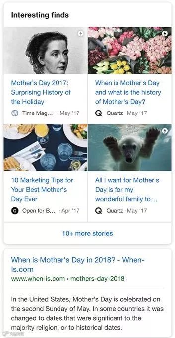 Google测试“Interesting Finds”功能,结果包含AMP页面,四个结果中有三个都是AMP页面。目前在桌面搜索结果看不到这个功能,只会在移动端出现,具体如下图所示: