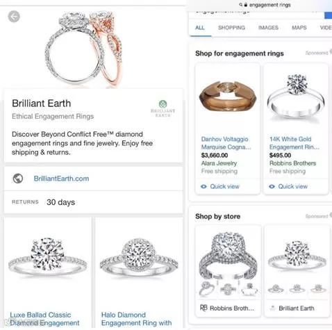 Google移动端正在测试在同一个搜索结果页面上展示两种类型购物广告的轮播图,分别是标准的产品列表广告和Showcase Shopping广告。下图是“ engagement rings”的搜索结果: