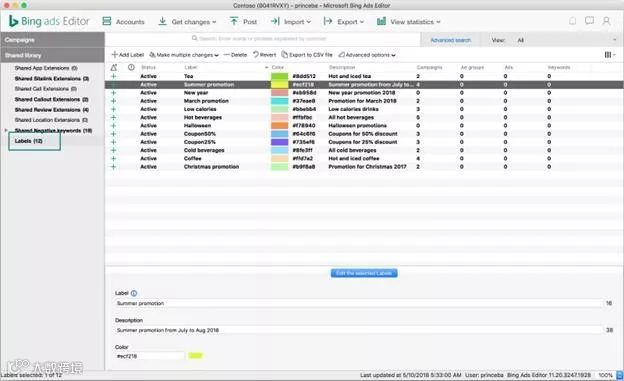 适用于Mac和Windows的最新版Bing Ads Editor增加了新功能。首先,在Mac上增加了标签管理功能,标签可以帮助搜索营销人员更有效地管理他们的帐户,以便他们可以快速筛选结果并更改,现在Mac上的Bing Ads Editor可以在Shared Library中创建标签: