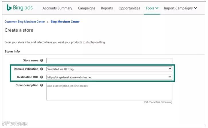 第二,之前广告商必须通过Bing网站管理员工具来验证域名,但现在可以通过使用UET(Universal Event Tracking)标签轻松验证其在线商店的域名。通过BMC验证域名时,这个标签所在的域名将显示在"Create a Store"页面的下拉菜单中,如下图所示: