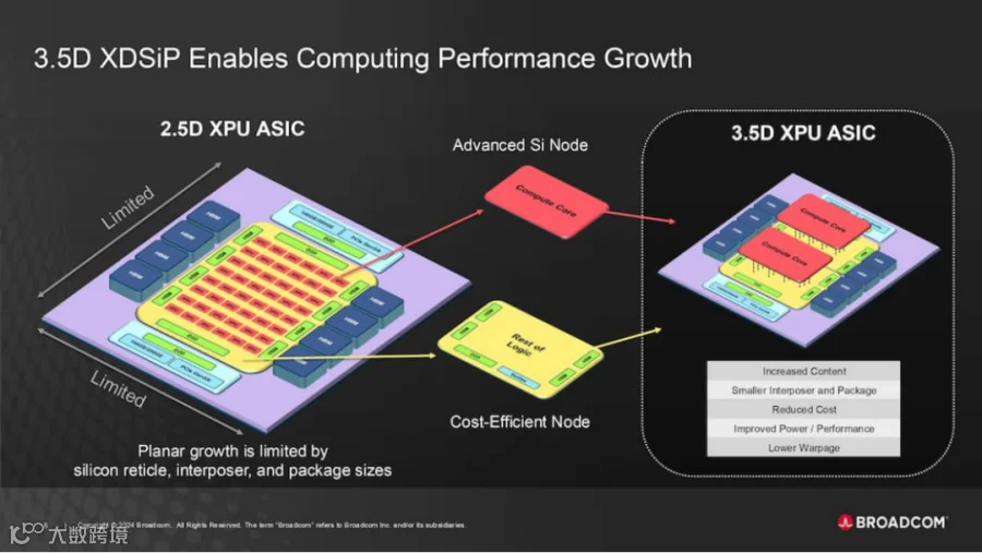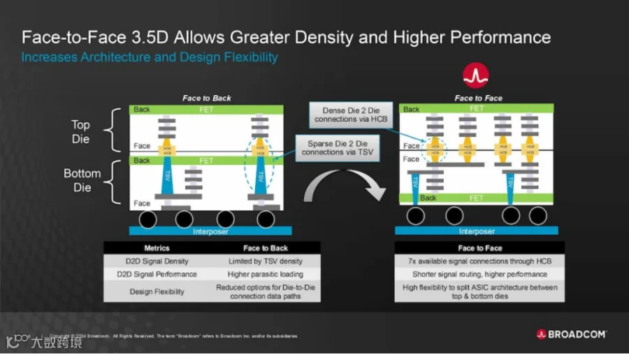 博通指出,F2F技术可让信号链接数量增加7倍、缩短信号路径,同时将芯片间界面的耗电量降低90%,减少3D堆栈内运算、内存和I/O元件间的延迟时间,并实现更小的中间层(Interposer)和封装尺寸,从而节省成本并改善封装翘曲问题,为设计团队在上下芯片间重新分解ASIC架构提供更多灵活性。