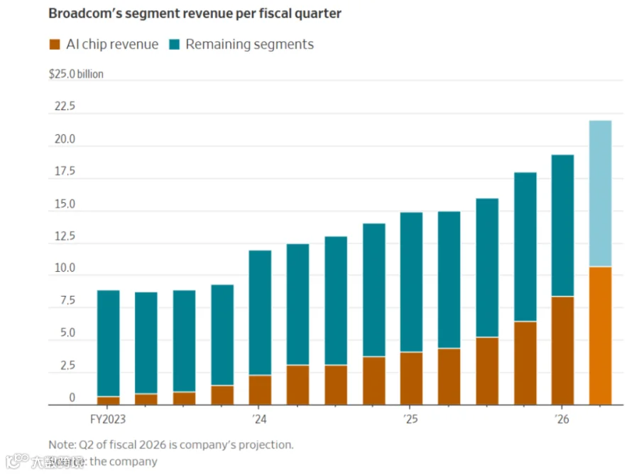 博通还必须巧妙地处理其非AI业务。这包括向苹果供应的芯片以及公司的基础设施软件业务。软件目前约占博通总营收的40%。