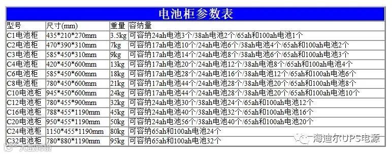 海迪尔UPS不间断电源主机搭配的电池及电池柜尺寸规格如下