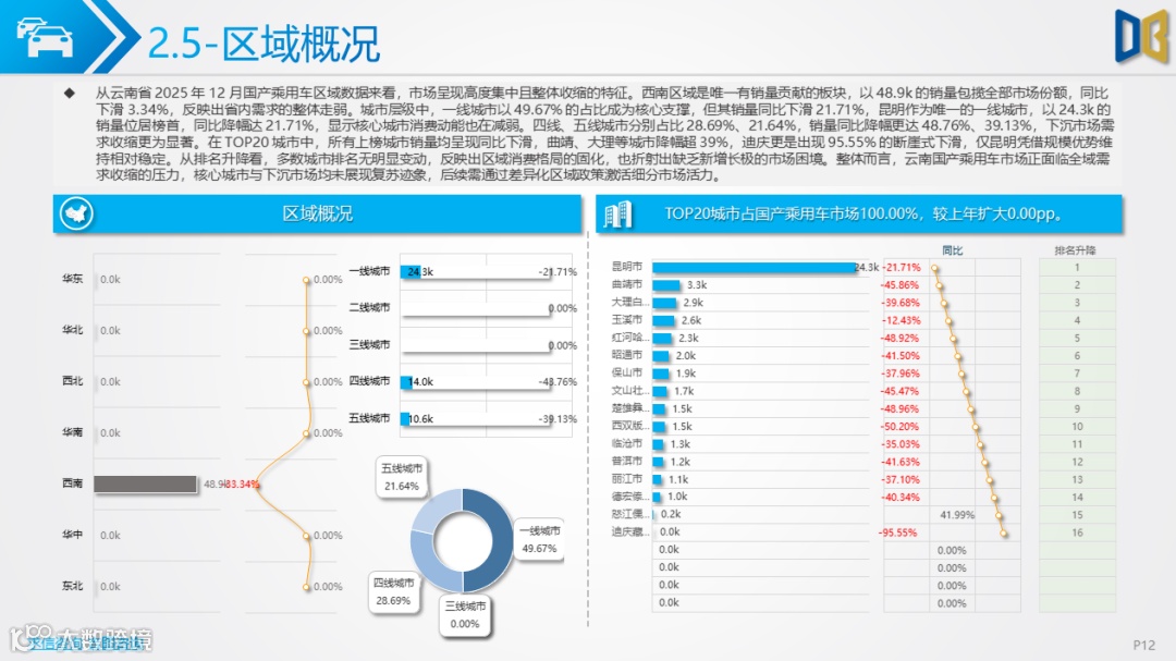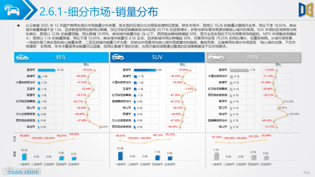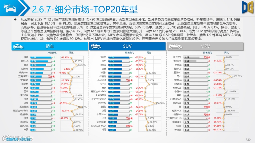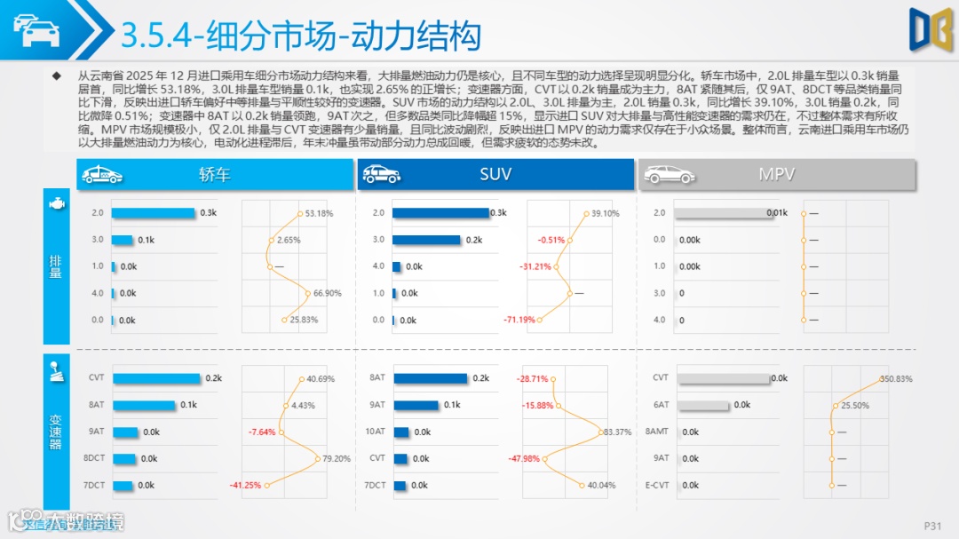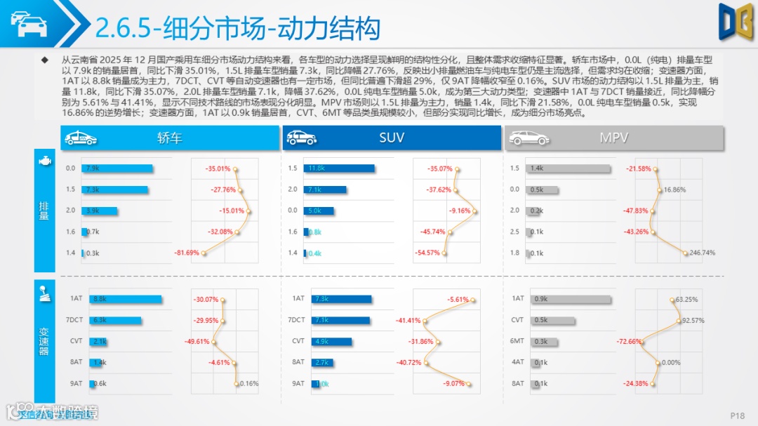 结构性转型加速,新势力与高端车型突围国产乘用车作为云南车市的核心支柱,12 月展现出清晰的 “消费升级 +电动化” 转型趋势,细分品类的动力选择、车型级别与头部格局均出现显著分化。动力与车型结构方面,电动化转型持续深化但需求整体收缩:轿车市场中 0.0L(纯电)车型以7.9k销量居首,1.5L燃油车型紧随其后,但两者同比降幅均超27%;SUV市场以1.5L燃油车型为销量主力(11.8k),0.0L纯电车型以5.0k销量成为第三大动力类型,主流动力品类同比下滑幅度普遍超过35%。