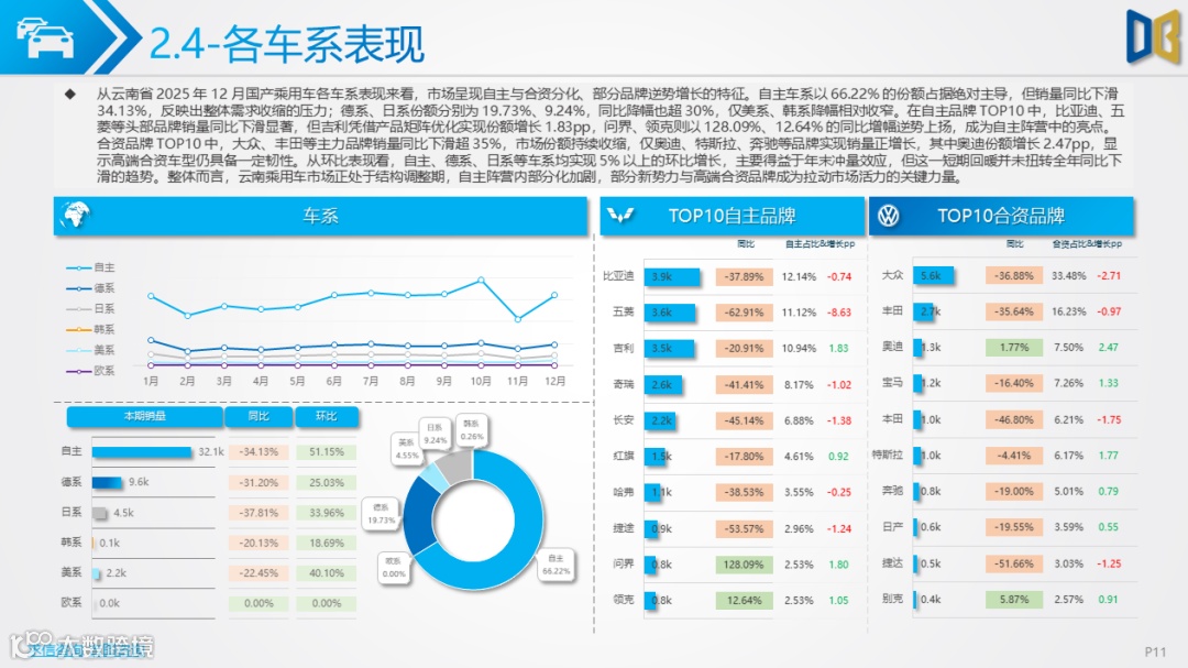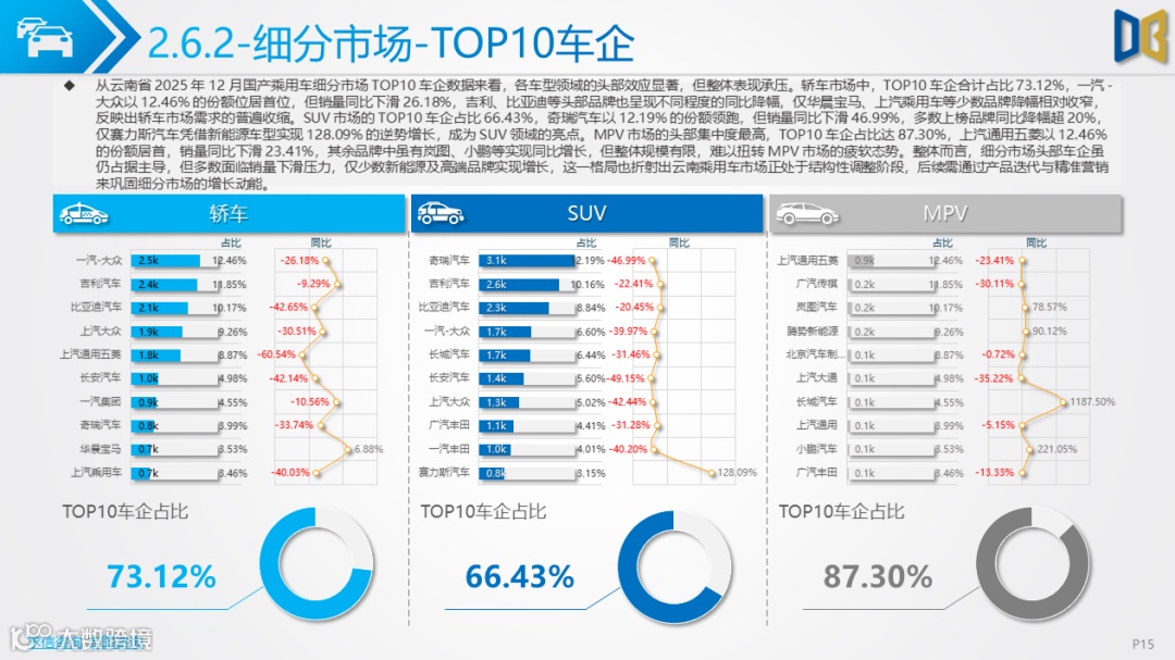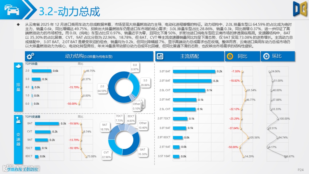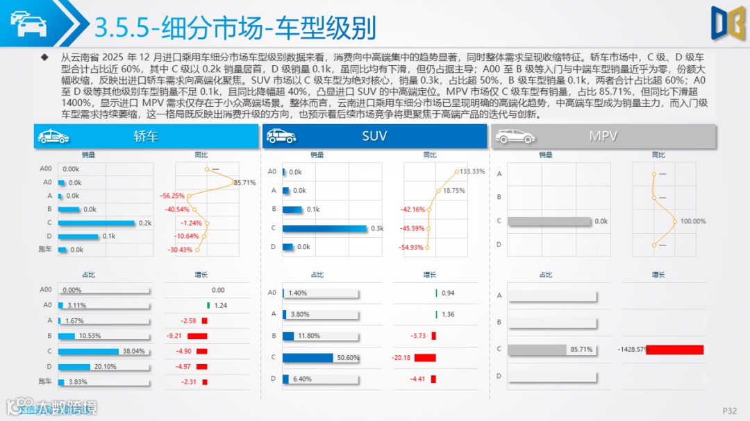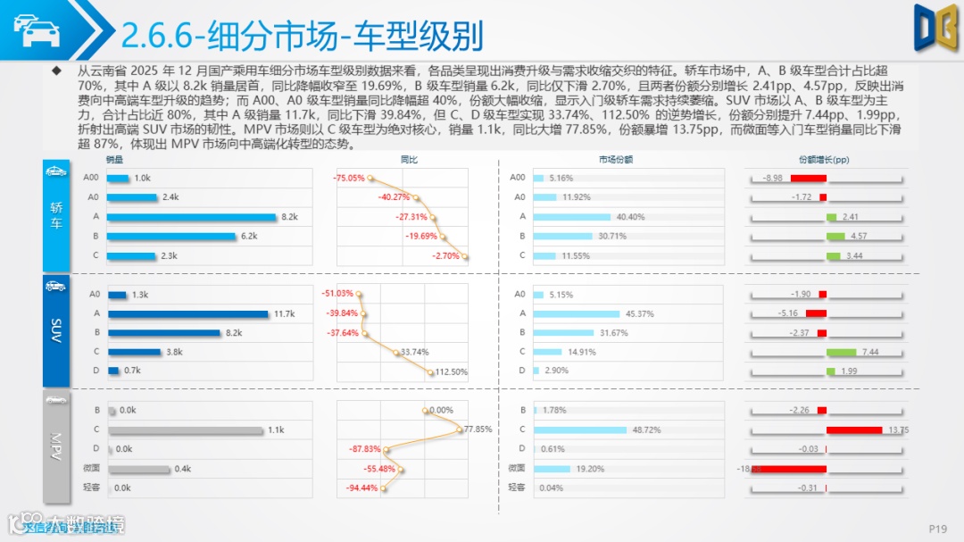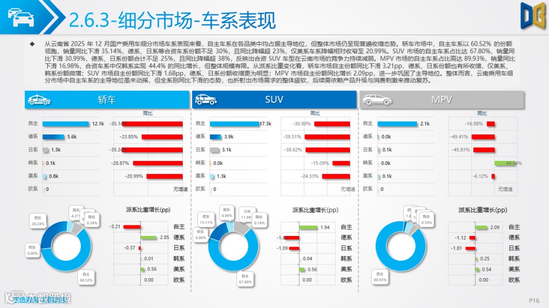 结构性转型加速,新势力与高端车型突围国产乘用车作为云南车市的核心支柱,12 月展现出清晰的 “消费升级 +电动化” 转型趋势,细分品类的动力选择、车型级别与头部格局均出现显著分化。动力与车型结构方面,电动化转型持续深化但需求整体收缩:轿车市场中 0.0L(纯电)车型以7.9k销量居首,1.5L燃油车型紧随其后,但两者同比降幅均超27%;SUV市场以1.5L燃油车型为销量主力(11.8k),0.0L纯电车型以5.0k销量成为第三大动力类型,主流动力品类同比下滑幅度普遍超过35%。