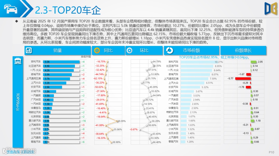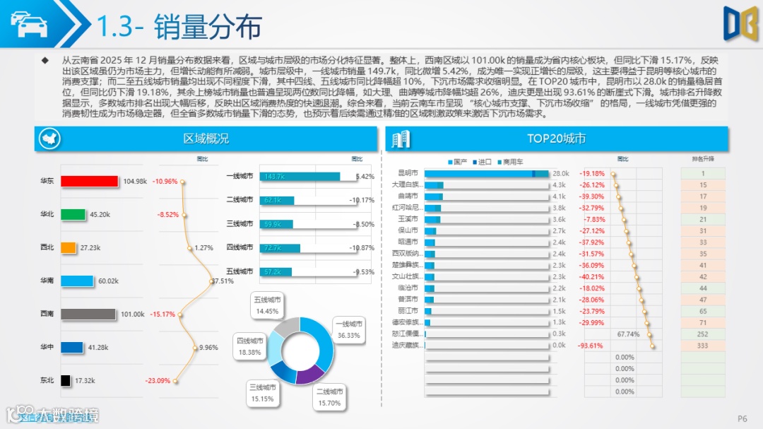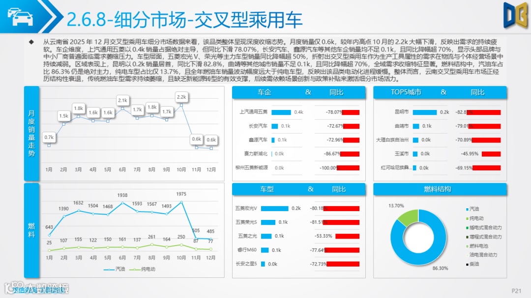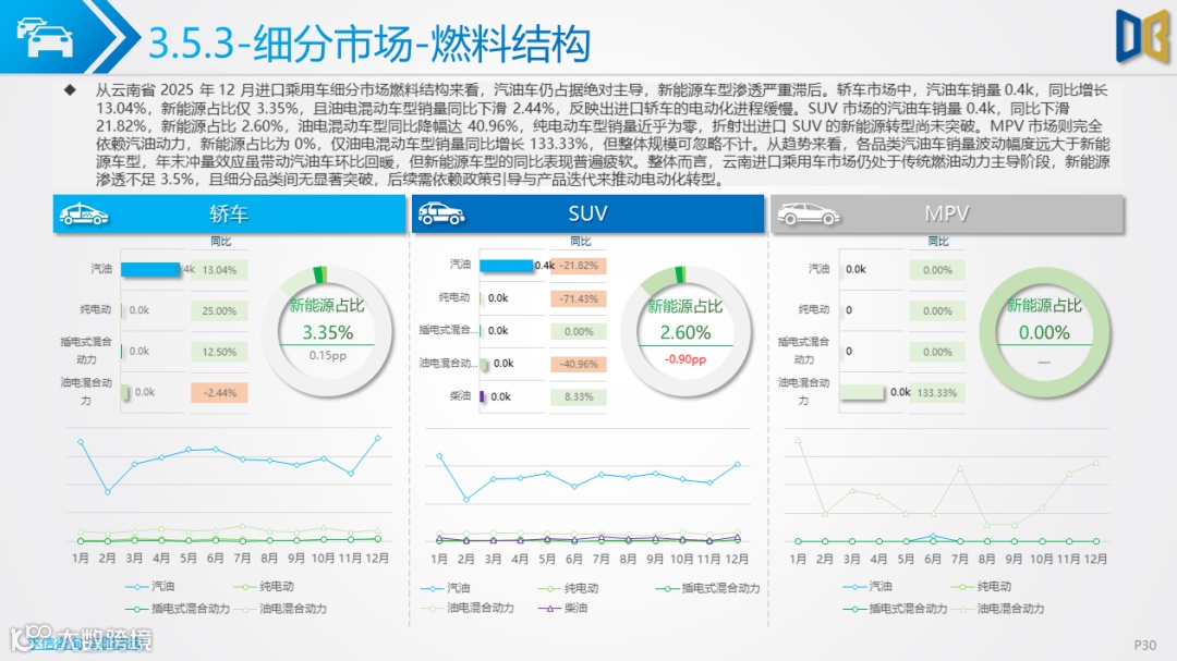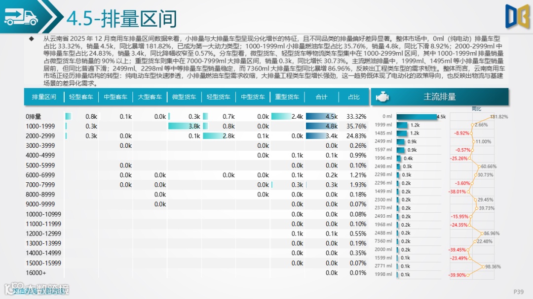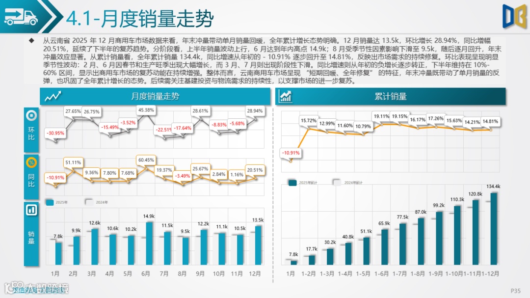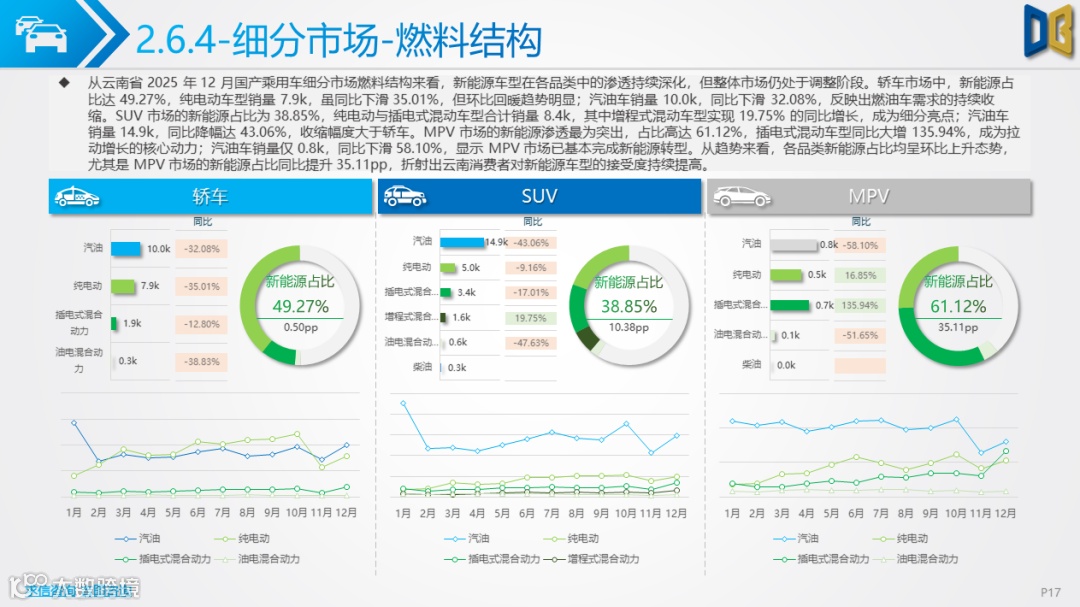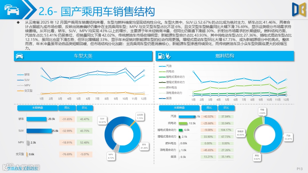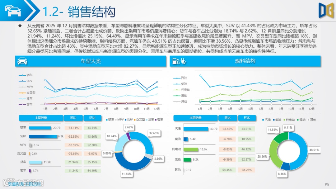 年末冲量效应显著,电动化与细分场景驱动增长商用车市场12月表现亮眼,年末冲量效应显著,全年累计增长态势明确,成为云南车市的重要增长引擎。销量趋势上,12 月单月销量达13.5k,环比增长28.94%,同比增幅20.51%,全年累计销量134.4k,同比增速从年初的- 10.91% 逐步回升至14.81%,展现出强劲的复苏动能。车型与燃料结构呈现结构性转型:货车作为绝对主力(占比87.72%),需求向小微与重型两端分化——轻型货车销量居首但同比下滑45.06%,微型、重型货车同比增长超100%;客车占比仅12.28%,大型客车需求近乎停滞。燃料结构中,电动化进程显著提速:纯电动车型以4.5k销量、33.32%占比成为第二大动力类型,同比暴增181.82%;柴油车虽仍占37.19%的最大份额但同比下滑5.73%,汽油车占比28.42%且同比下降7.03%。