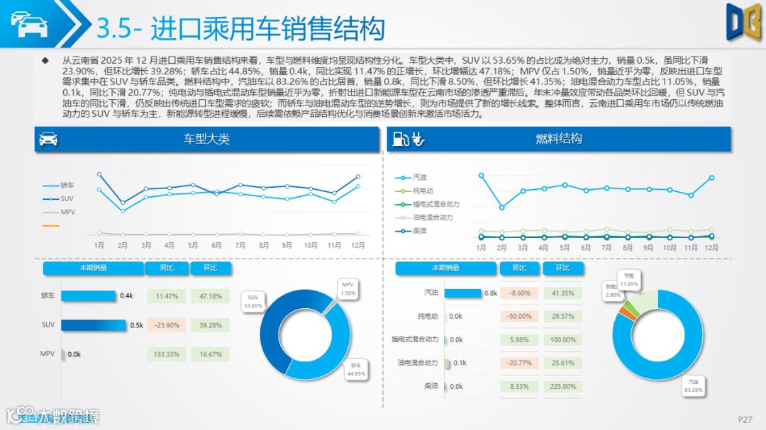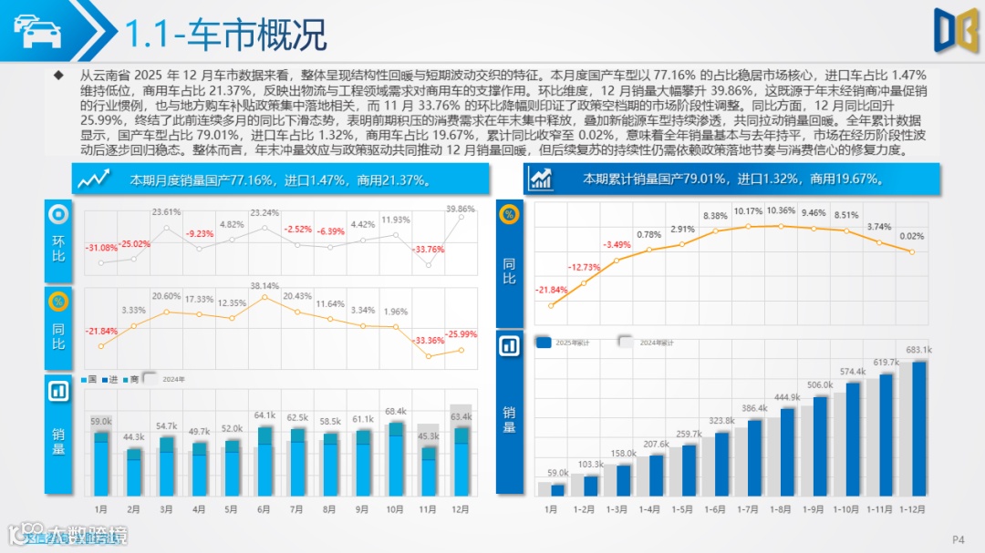 2025年12月,云南省汽车市场在年末冲量效应与行业转型浪潮的双重作用下,呈现出 “整体回暖与结构分化并存、新能源渗透加速与传统动力承压共生” 的鲜明特征。从市场全局来看,商用车市场凭借基建与物流需求的支撑实现单月与全年的双重增长,乘用车市场则在国产与进口板块呈现差异化表现 —— 国产车型聚焦消费升级与电动化转型,进口车型仍深陷传统燃油依赖与区域集中的困境。以下结合各细分市场核心数据,对云南车市进行全方位深度解析。