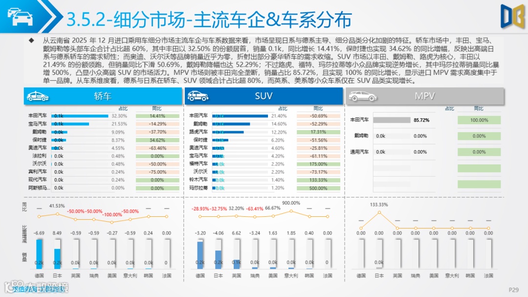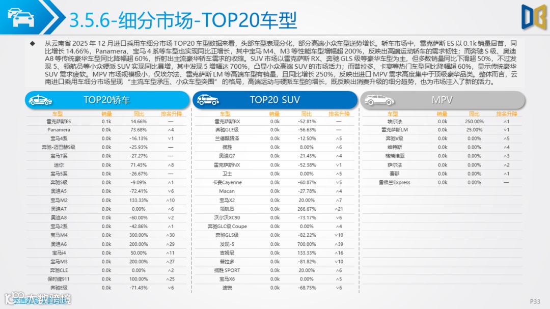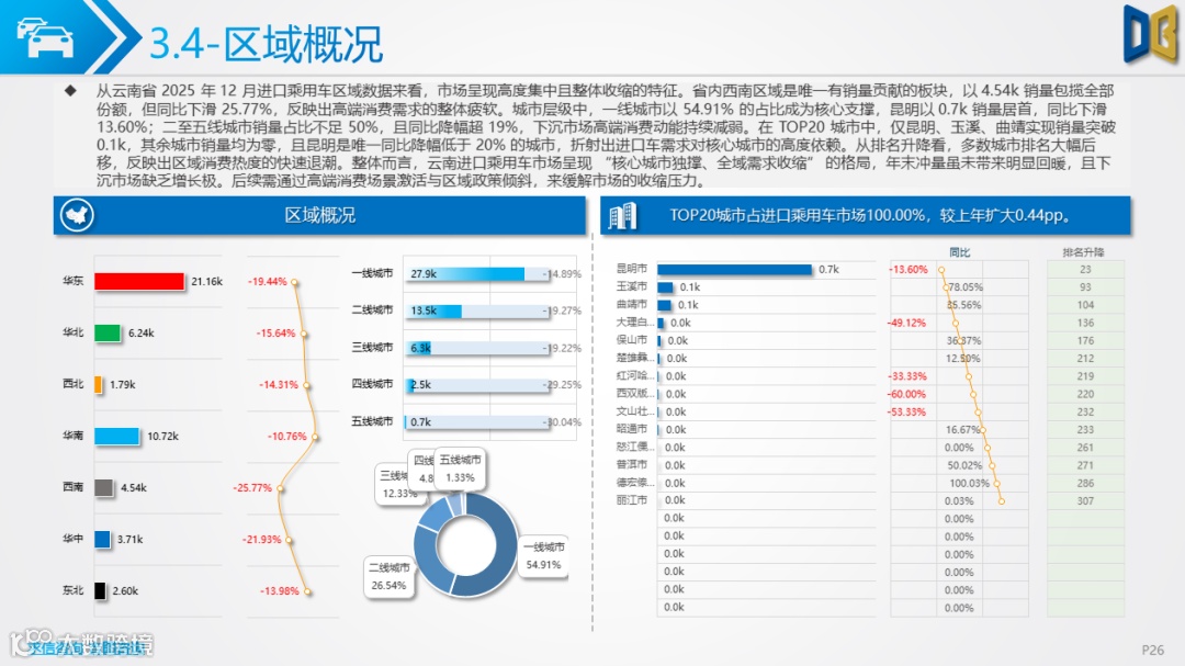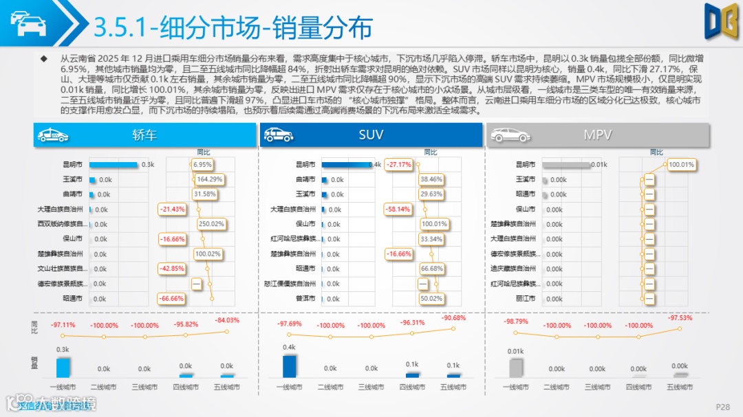 动力与燃料结构方面,传统大排量燃油动力仍占据绝对主导:2.0L、3.0L排量车型合计占比超93%,其中2.0L车型同比增幅达49.75%,而 0.0L纯电车型占比仅0.97%,销量近乎为零且同比下滑50%;燃料结构中汽油车占比83.26%,油电混动车型占比11.05%,纯电与插电式混动车型渗透严重滞后,新能源占比不足3.5%,远低于全国平均水平。区域分布上,进口车需求呈现极致的集中化特征:省内西南区域包揽全部销量但同比下滑 25.77%,昆明作为唯一核心城市,贡献了轿车与SUV市场的绝大部分销量,二至五线城市销量近乎为零,同比降幅超97%,下沉市场完全陷入停滞。