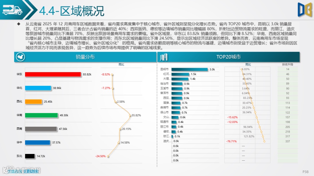 头部车企与品牌格局呈现 “头部集中、品类分化” 特征:TOP20 车企合计占比72.04%,上汽通用五菱夺冠但同比微降1.35%,北汽福田、中国重汽同比增长超130%;豪沃、徐工等工程类品牌销量同比暴增超200%,江铃、陕汽等物流类品牌则面临需求收缩压力。区域分布上,省内需求高度集中于昆明、红河、大理等核心城市(三者合计占省内销量近40%),西双版纳、德宏等边境城市受益于边贸物流,销量同比增幅超80%;省外市场呈现区域分化,华东区域销量领跑但同比下滑8.52%,华南、西南区域实现超20%的增长。