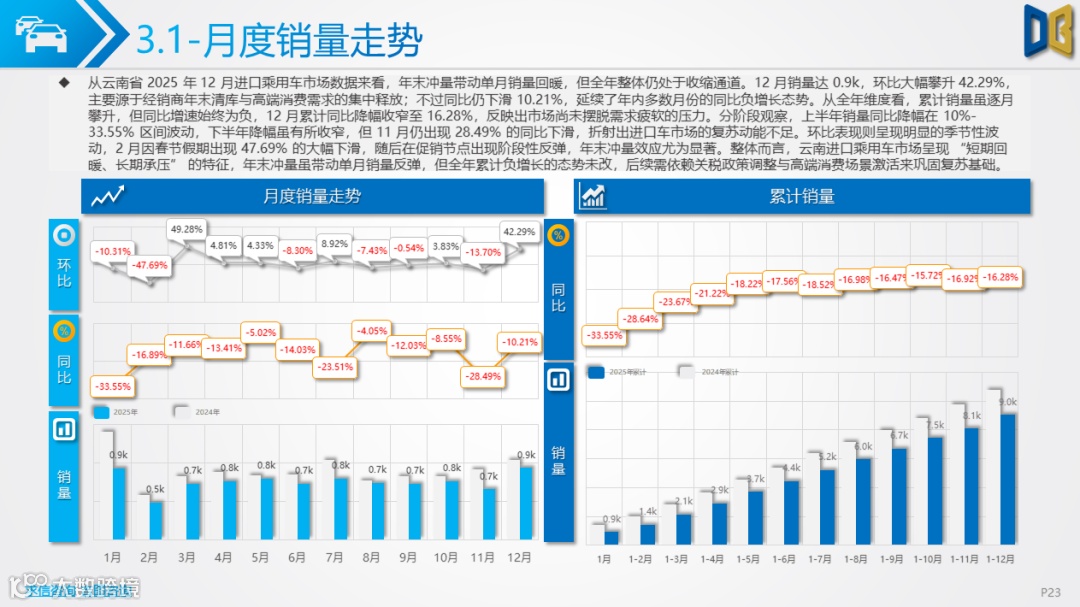 展望未来,云南车市需依托政策红利与地理优势,进一步完善新能源基础设施,推动进口车市场产品结构优化,强化商用车细分场景适配能力,才能巩固复苏基础,实现高质量发展。