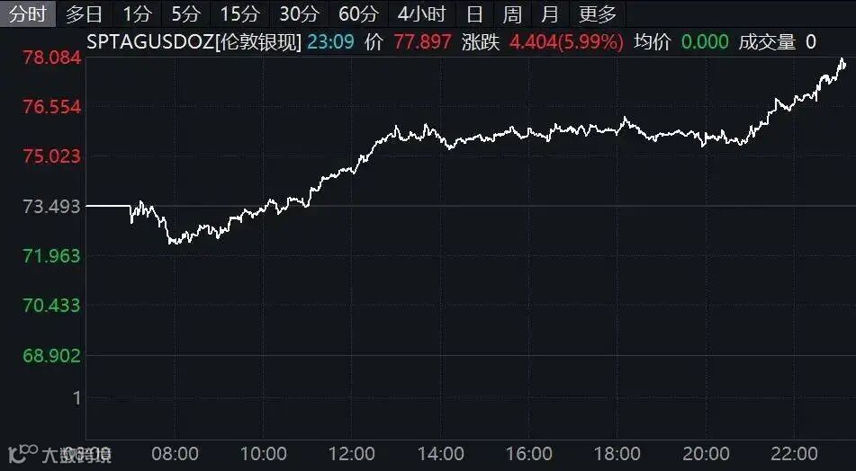 国际贵金属集体拉升,截至发稿,现货黄金再度站上5000美元/盎司,涨超2.5%,现货白银涨幅扩大至6%,现货铂金涨超3%,现货钯金涨5.5%。纽约期银涨超5%,期金涨超2%。