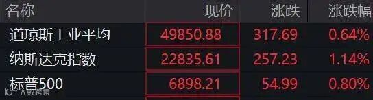 三大股指拉升扩大涨幅,截至发稿,道指涨0.64%,纳指涨超1%,标普500指数涨0.8%。