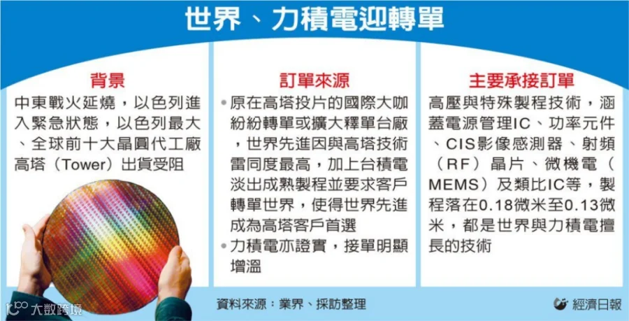 业界指出,以色列为高塔生产大本营,聚焦高压与特殊制程,涵盖电源管理IC、功率元件、CIS感测器、射频、MEMS及类比讯号IC等,主力制程落在0.18~0.13微米,相关技术也是力积电擅长领域。