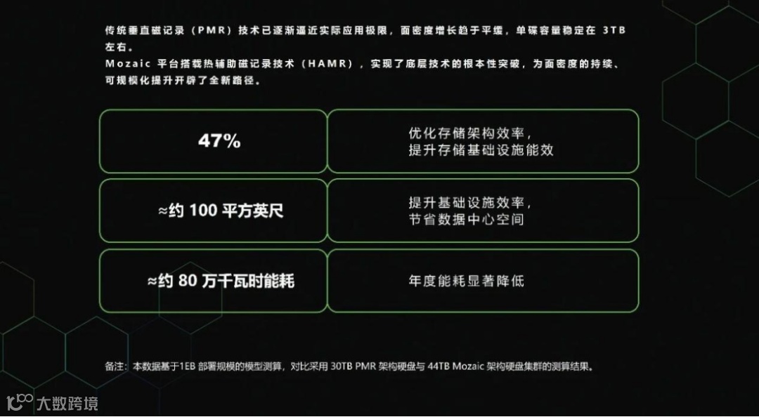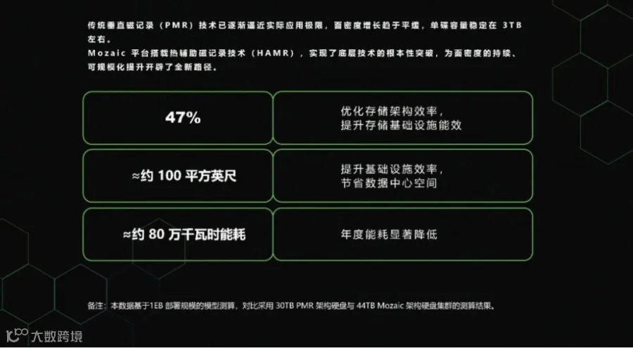 在1EB部署规模中,相较于标准30TB,希捷魔彩盒(Mozaic)可提升约47%的基础设施效率,减少约100平方英尺的数据中心占地面积,降低约80万千瓦时的年能耗。在AI规模应用中,这些效率提升能够带来显著的经济价值。
