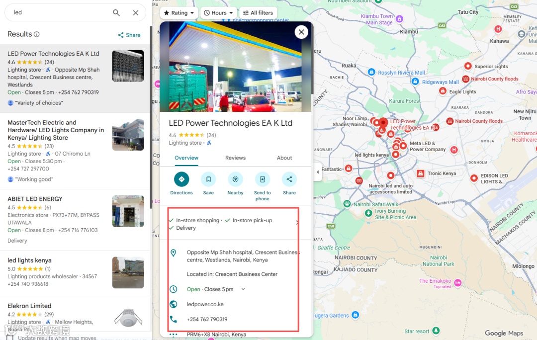 谷歌地图是肯尼亚最常用的地图之一,收录了非常多的肯尼亚本土企业,非常推荐的一种地毯式开发方式,搜索一般是先定位想要开发的城市,然后输入产品关键词进行搜索开发即可。