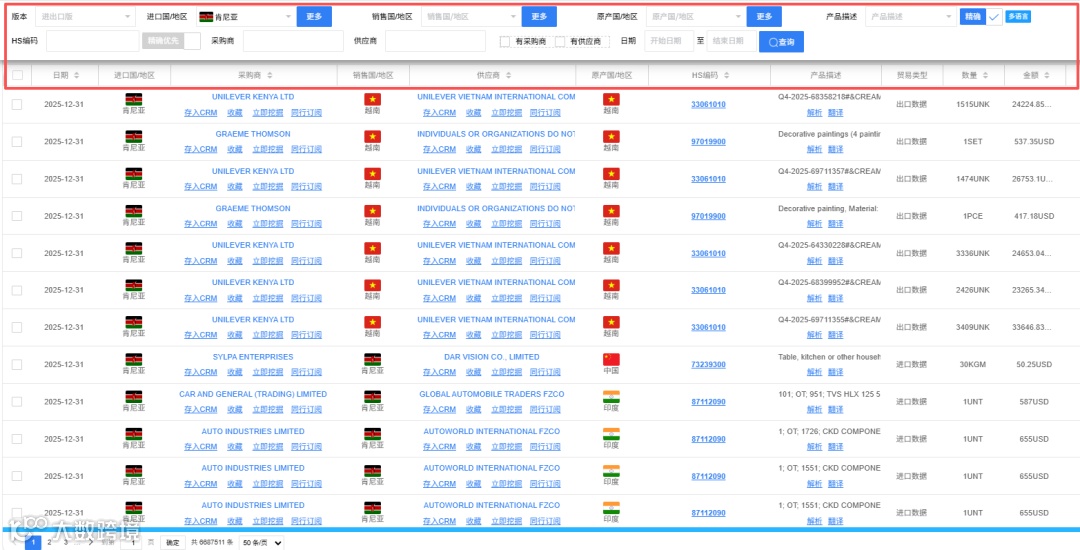 肯尼亚是开放海关数据,海关数据也是非常不错的客户开发方式,可以分析客户,也可以开发客户,直接用产品关键词搜索就可以了。