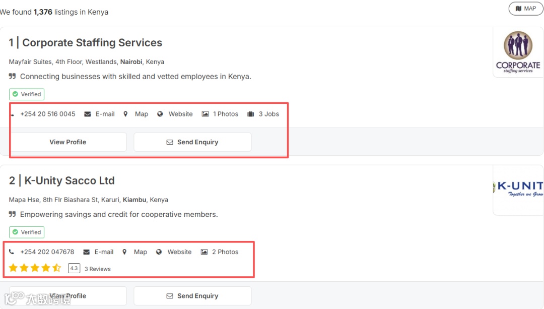 这个是肯尼亚本土的一个商业名录网站,收录了超过12万家的肯尼亚本土企业,可以按照关键词搜索,也可以直接按照行业去查看。可以直接看到电话、地图、网站以及邮箱等等,还是非常不错的。