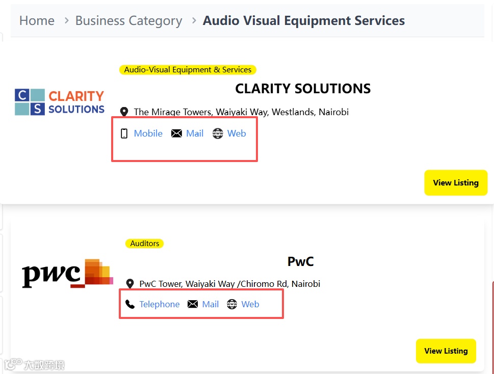 这个是肯尼亚本土的一个商业目录网站,还有点类似国内的58那种分类广告网站,可以通过关键词直接搜索开发,可以看到客户的电话,也可以直接通过WhatsApp进行联系。