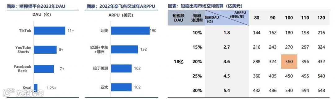 海外短剧市场潜力巨大,国海证券测算其高值可达648亿美元;2023年Q4月总流水已超1500万美元。短视频平台庞大流量为行业奠基——全球短视频DAU达18亿。