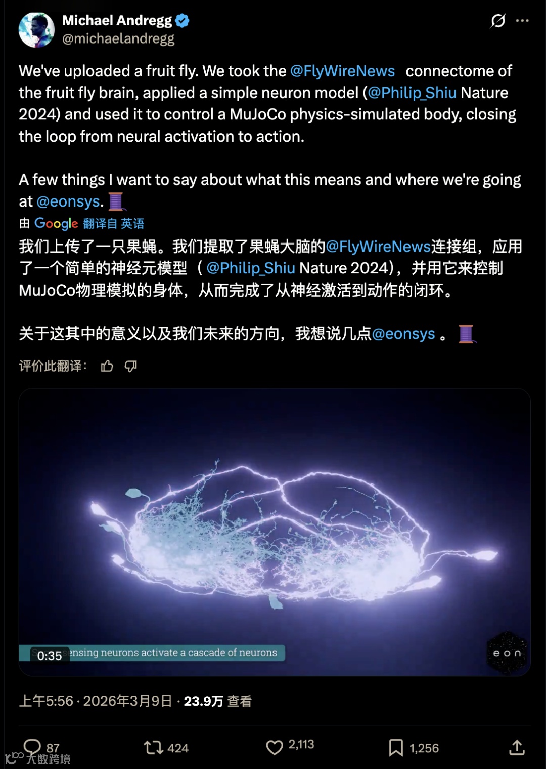 前日,Eon Systems公司发布视频《The First Multi-Behavior Brain Upload》(首次多行为大脑上传),引发全球科技圈广泛关注与热议。