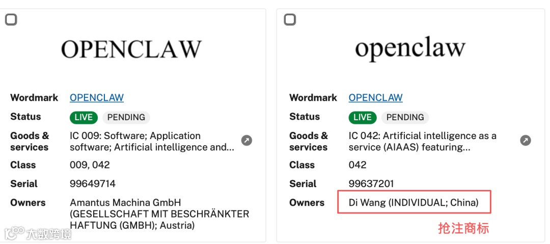 其实未必。因为创始人手里还有一张关键的牌——商标优先权。OpenClaw在美国的申请虽然是 2月12日,但它是基于 奥地利商标申请进行的国际布局。