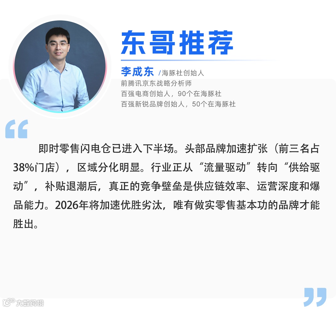 前几年大家比点位多,今天大家比的是谁货盘更硬、谁的中心仓更稳、谁能做到“下单必有货”。闪电仓的本质,正从点位竞争,走向区域供给资源调度。谁把爆品放得更近,谁把履约做得更确定,谁就更有资格留在牌桌上。