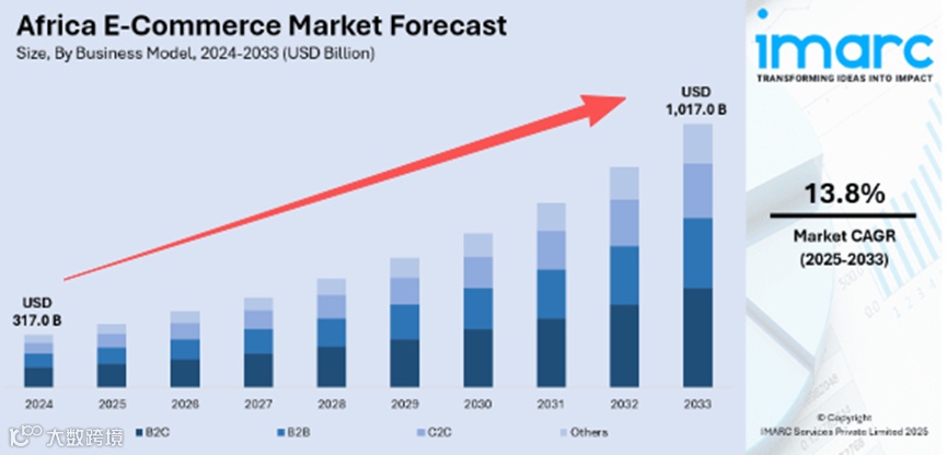 IMARC集团数据指出,截至2024年,非洲电商市场规模市场已超过3710亿美元,预计到2033年将进一步扩容至10170亿美元,复合年增长率达13.8%。